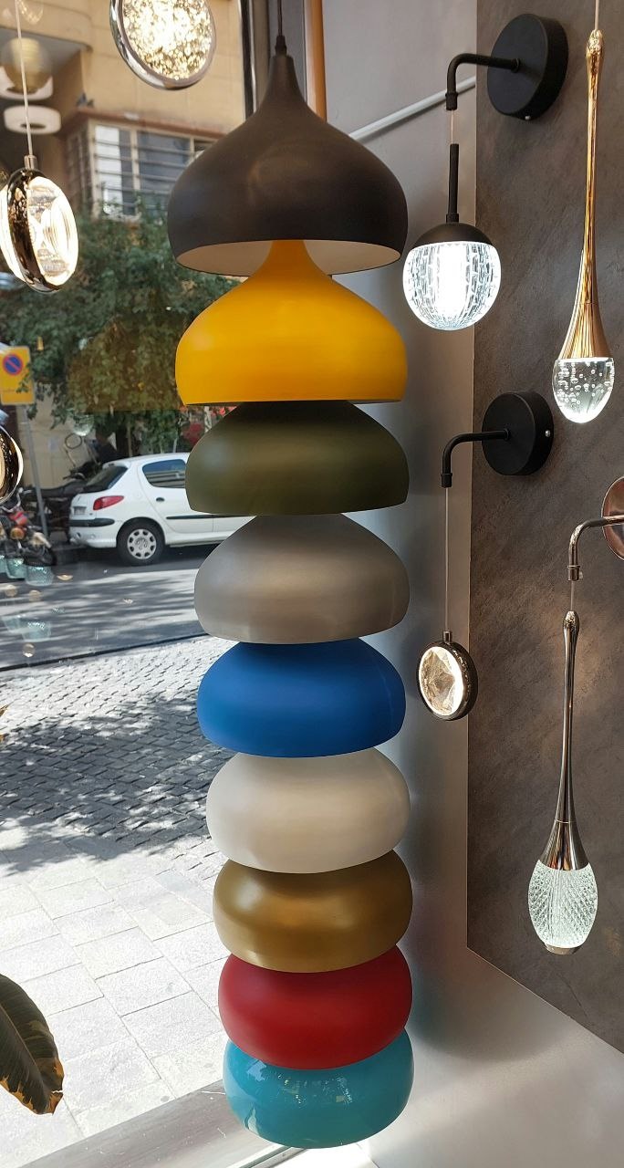چراغ آویز مدل کاشان از جنس آلومینیوم و در رنگبندی متفاوت آبی و قرمز و لیمویی و طوسی و سفید و مشکی موجود می باشد. رنگ داخلی چراغ های آویز کاشان به رنگ سفید می باشد البته رنگ مشکی آن با رنگ داخل طلایی رنگ آمیزی شده است. تمامی رنگ های به کار رفته در چراغ آویز مدل کاشان از جنس الکترو استاتیک می باشد.